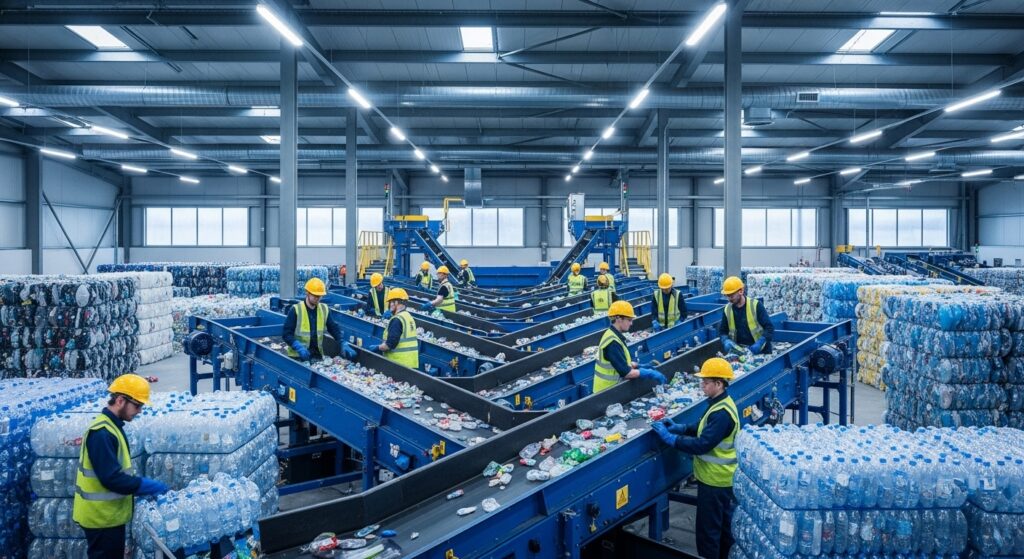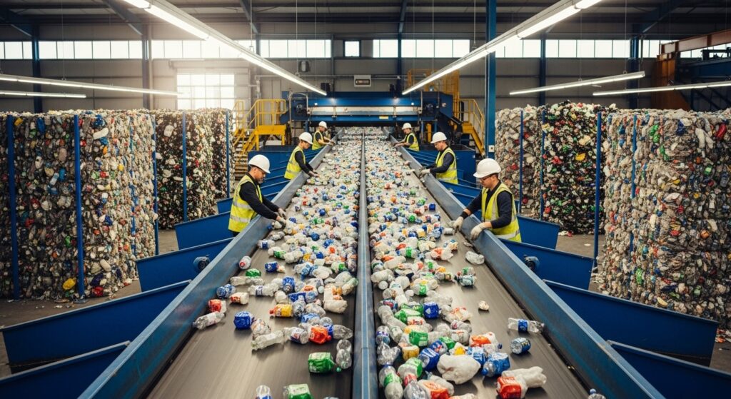 PET materials — including clear plastic bottles, trays, and packaging — are recycled and transformed into flakes or pellets for reuse in textiles, packaging, and molded applications.
